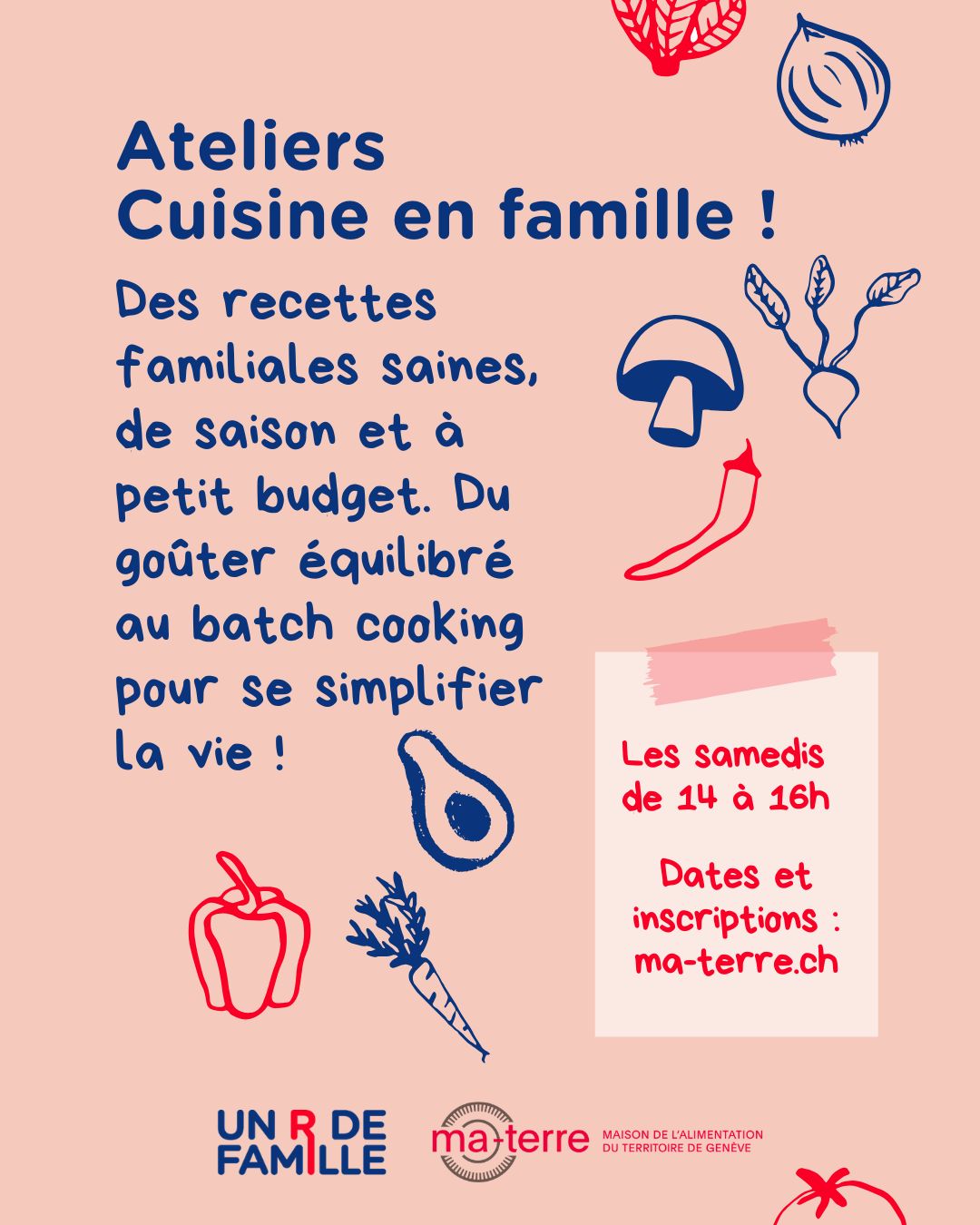 Durant ces ateliers organisés par notre restaurant Un R de Famille, nous vous donnons rendez-vous à la Maison de l’Alimentation du Territoire de Genève (MA-Terre), pour un échange autour de l’agriculture locale avant de cuisiner avec notre équipe qui vous fera prendre conscience qu’il est tout à fait possible de réaliser des mets sains, même pour le goûter, tout en respectant un budget et ..un timing ! A l’issue de l’atelier vous pourrez à votre guise manger sur place ou emporter ce que vous avez cuisiné. Merci d’amener votre contenant.